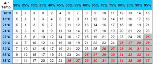 露(lu)點表(biao)根據(ju)濕度(du)和溫(wen)度給(gei)出露(lu)點溫(wen)度(C),冷(leng)卻水(shui)必須(xu)高于(yu)露點(dian)溫度(du)以防(fang)止結(jie)露。